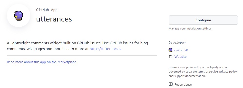 https://github.com/apps/utterances을 클릭하면 아래 그림과 같이 utterances 앱을 설치할 수 있는 화면이 나온다. 현재 이미 설치되어 있어 configure라고 되어 있지만, 신규 설치 시에는 install이라고 나오니 해당 버튼을 클릭하여 설치를 진행한다. 이후 나오는 화면에서 댓글을 저장하기 위한 repository를 선택한다.