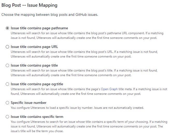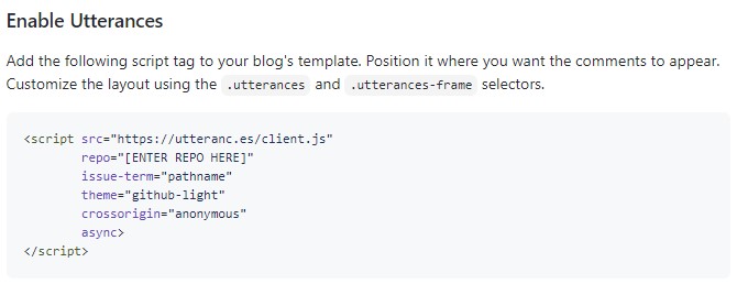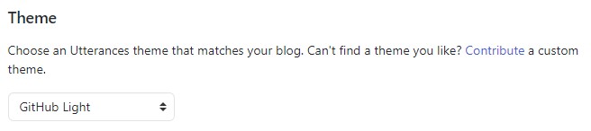 여기서, theme 및 issue_term은 utterances 설정 페이지의 Theme 부분과 Blog Post ↔ Issue Mapping 부분을 참조하여 값을 입력한다.